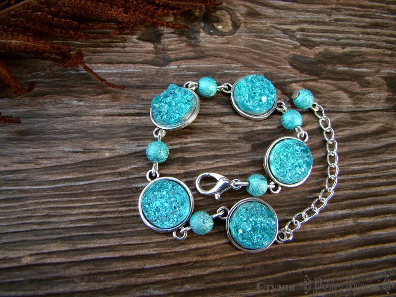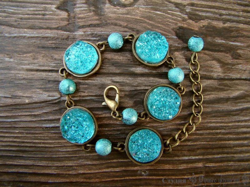 Элегантный браслет с мерцающими красталлами. Это не камень, как может показаться, но выглядит очень красиво и натурально. Напоминает друзу агата. Варианты оправы могут быть разными: серебристого и бронзового цвета (на выбор).