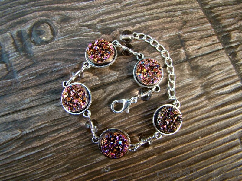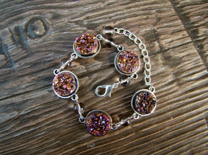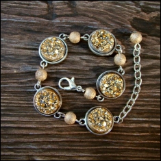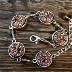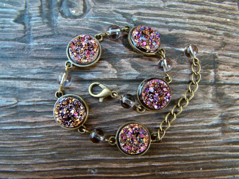 Элегантный браслет с мерцающими красталлами. Это не камень, как может показаться, но выглядит очень красиво и натурально. Напоминает друзу агата. Варианты оправы могут быть разными: серебристого и бронзового цвета (на выбор).