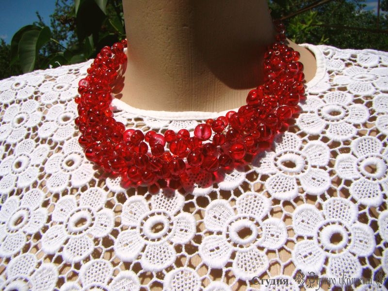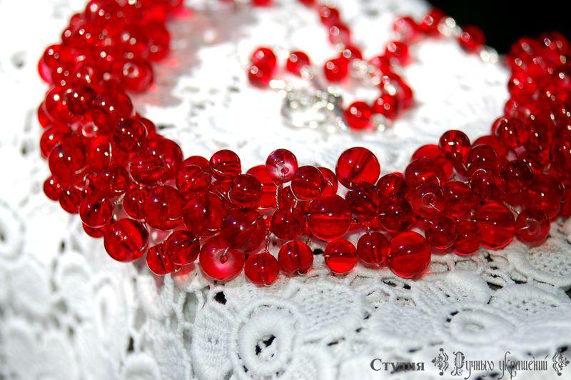 Очень красивое и яркое колье. Сделано из стеклянных бусин, которые красиво играют на свету. Украшение можно сочетать как с традиционным украинским нарядом, так и с обычной одеждой. Украшение напоминает россыпь красной смородины.