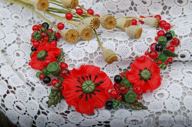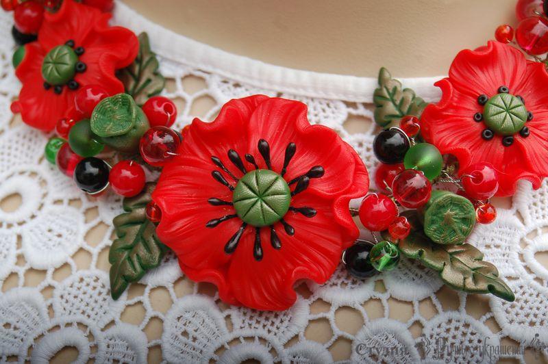Очень яркое колье с цветами маков. Необычайно женственное, очень украинское и просто прекрасное колье ручной работы. Цветы, маковки и листочки ручной работы из полимерной глины. Сложная сборка с добавлением различных бусин. Урашение прекрасно дополнит, как народный костюм, так и строгое черное платье.