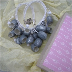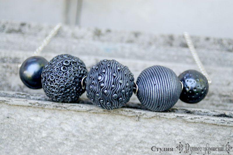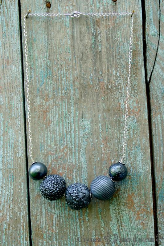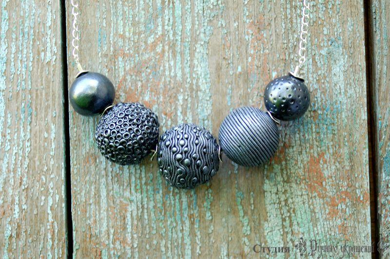 Крупное стильное колье серебристого цвета. Не смотря на размер нетяжелое. Каждая бусина изготовлена вручную и имеет индивидуальный узор и фектуру. Совершенно женское, непонятное мужчинам украшение.