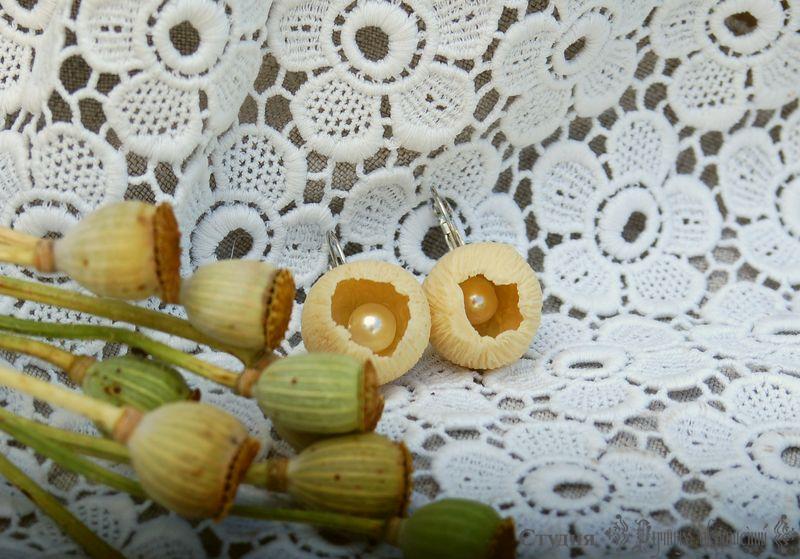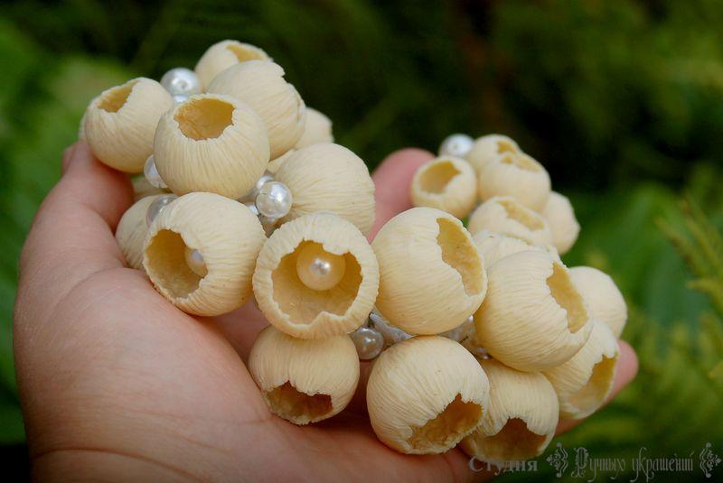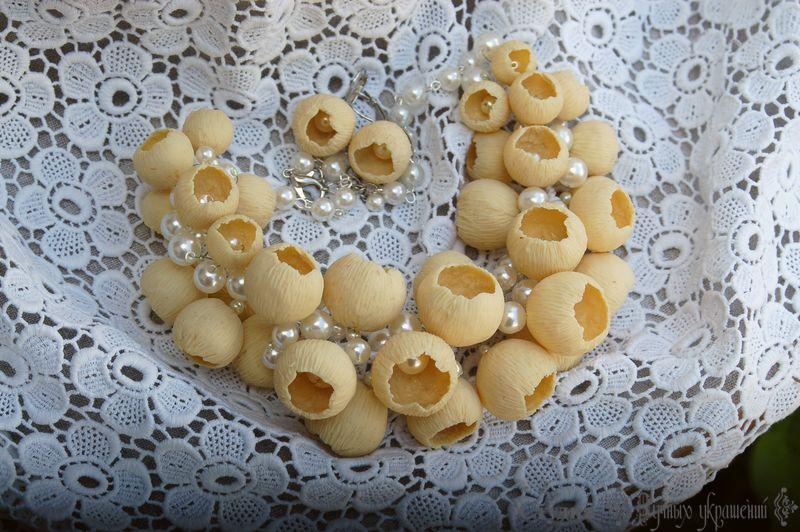 Нежное, легкое женственное украшение. Комплект состоит из объемного колье и сережек. Бусины, напоминаюшие бутоны или ракушки, выполнены из полимерной глины вручную. Украшение дополнено перламутровыми бусиными, такое сочетание делает его очень женственным. А лагодаря цвету "ванили", этот комплект можно сочетать с различными нарядами и быть нотразимой.