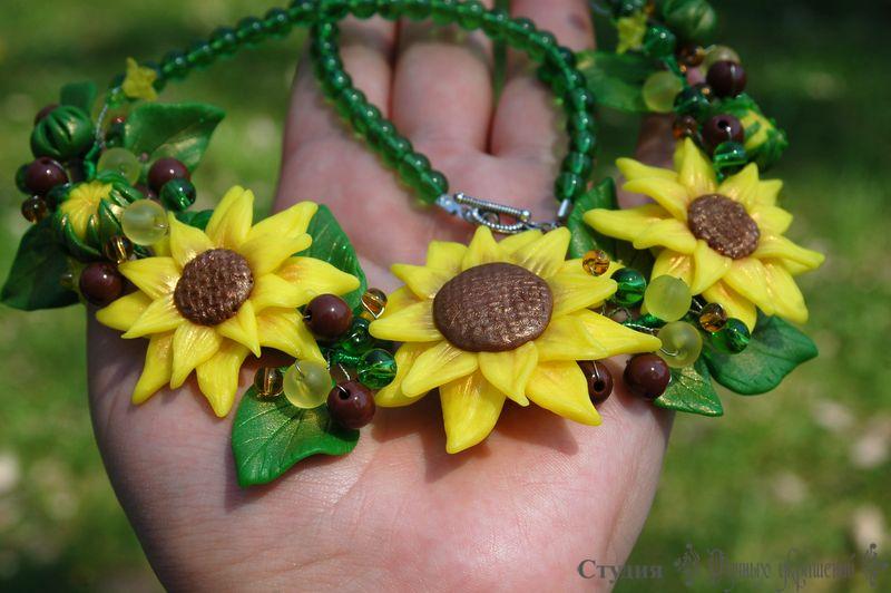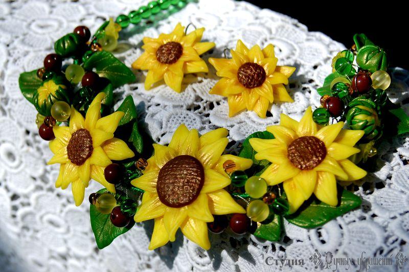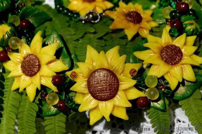 Совершенно летний, яркий и солнечный комплект из сережек и колье. Подсолнухи - цветы для жизнерадостных и ярких девушек. Надевая такие украшения противопоказано грустить!
