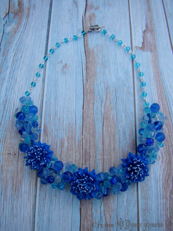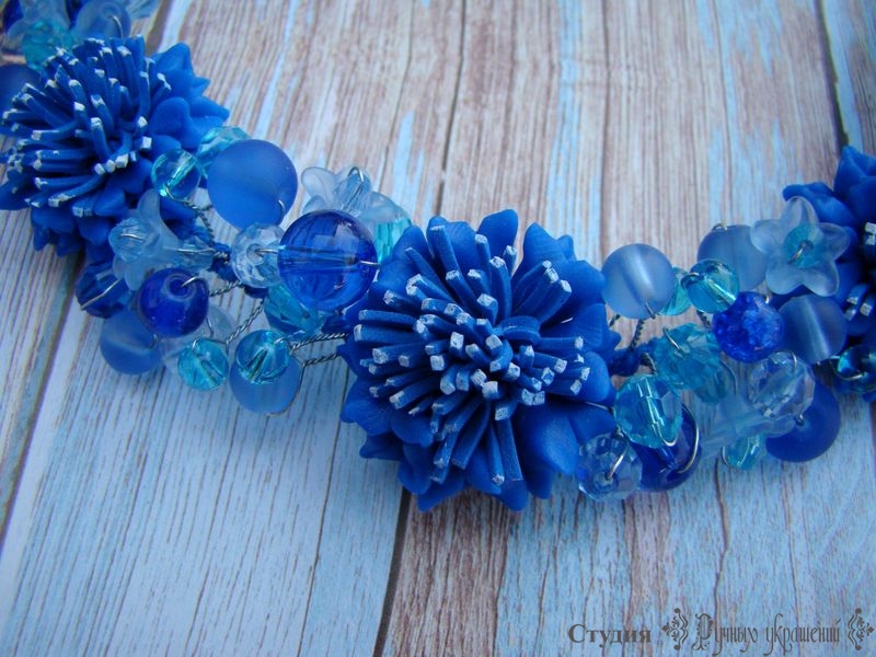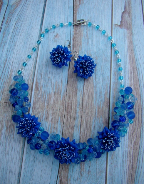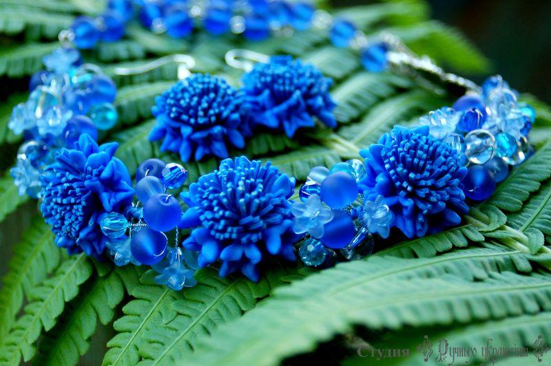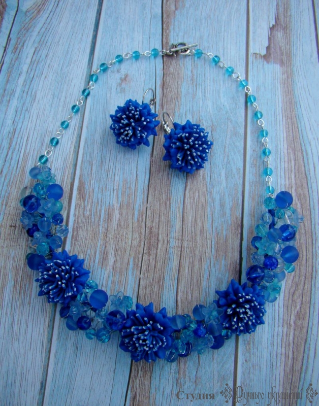 Очень красивый васильковый комплект. Прекрасные цветы дополнены разнообразными бусинами.