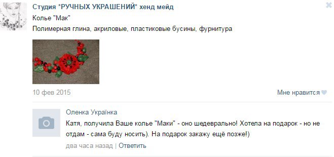 “Спасибо огромное за очаровательные и оригинальные украшения в украинском стиле! Ваши маки неповторимы! Мы всей семьей были на свадьбе в украинском стиле и своими заколками, браслетами, брошками всех удивили. Спасибо Вам огромное за Ваш талант! Творите и удивляйте нас и дальше, удачи Вам! и отдельное спасибо Вам за оперативность в работе и отправке нашего заказика!))) Еще добавлю фото наших красивенных маков)”