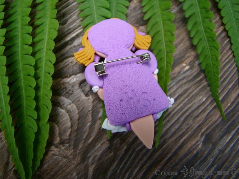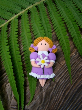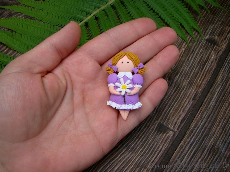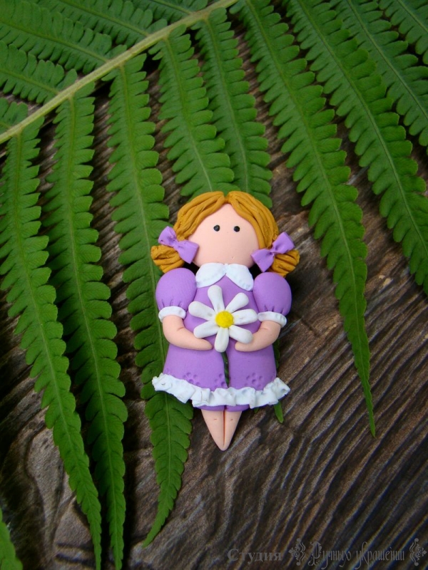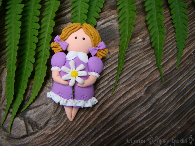 Милая девчушка в сиреневом платье с ромашкой. И это брошь.