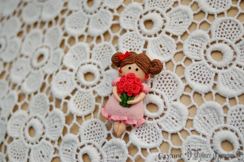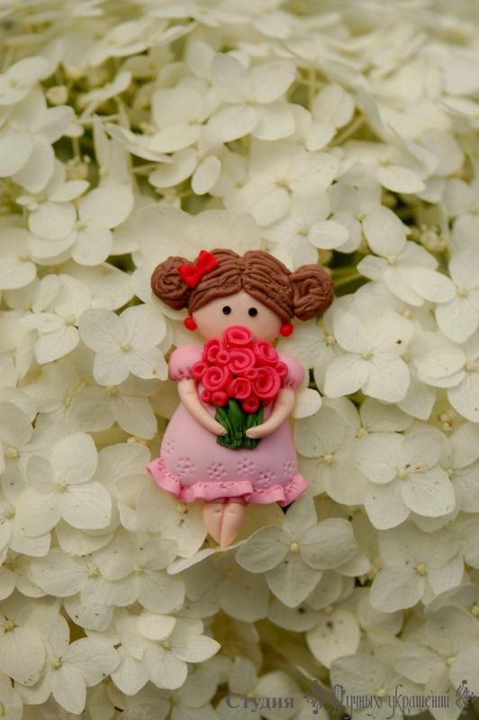 Девочка в розовом платье с букетом роз - что может быть романтичнее? Такая совершенно девочковая брошь.