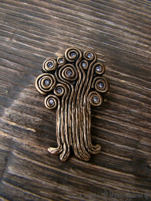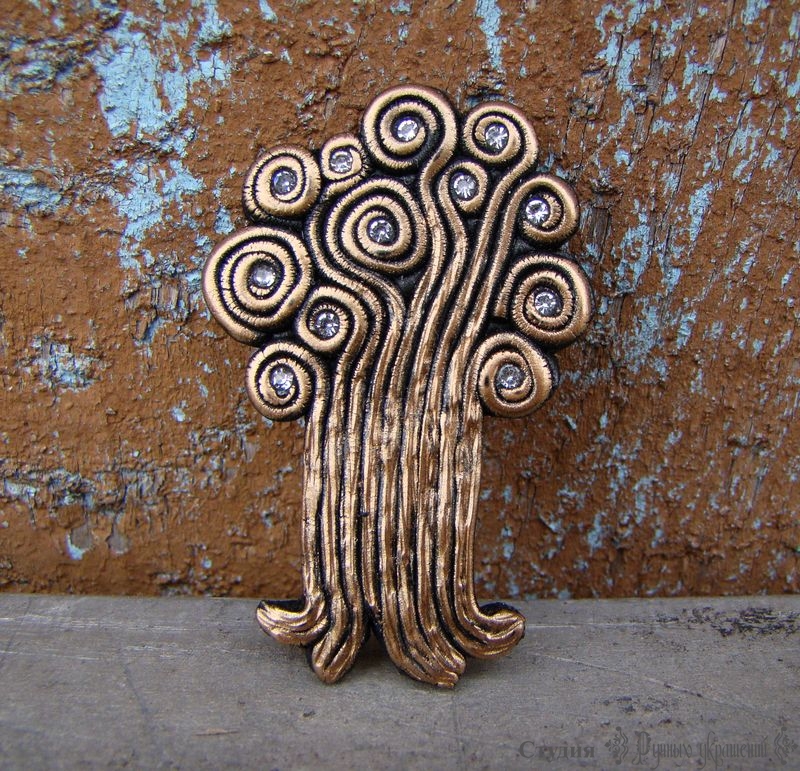 Брошь из полимерной глины в виде дерева выполнена в технике "имитация металла".