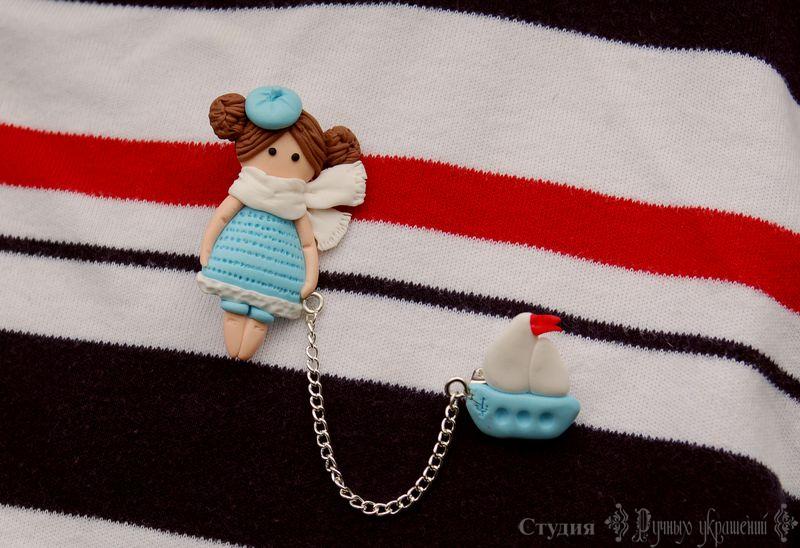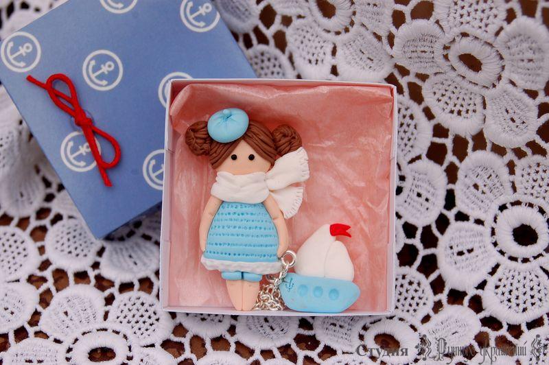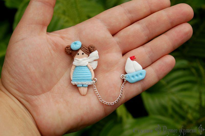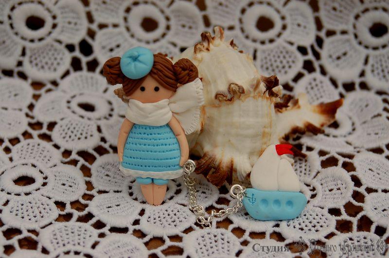Размер девочки - 5х3 см, размер кораблика - 2х2 см, длина цепочки - 6 см