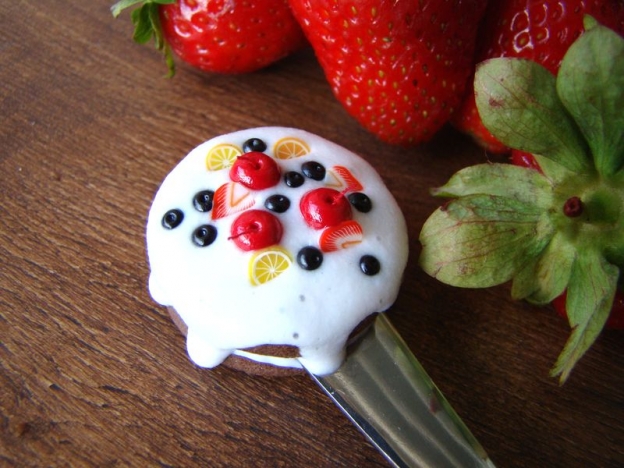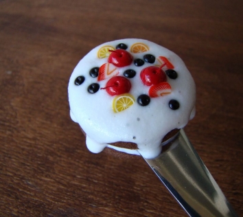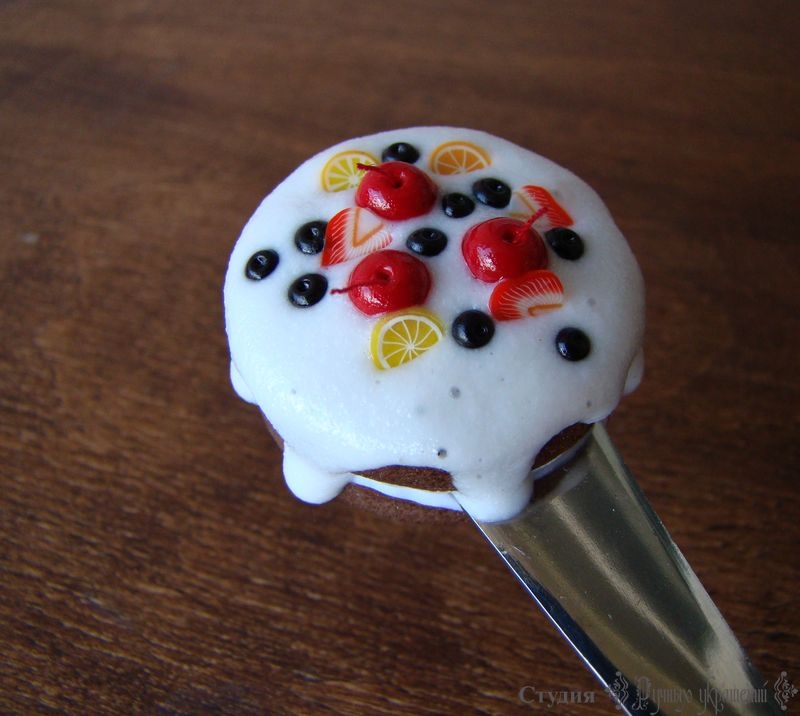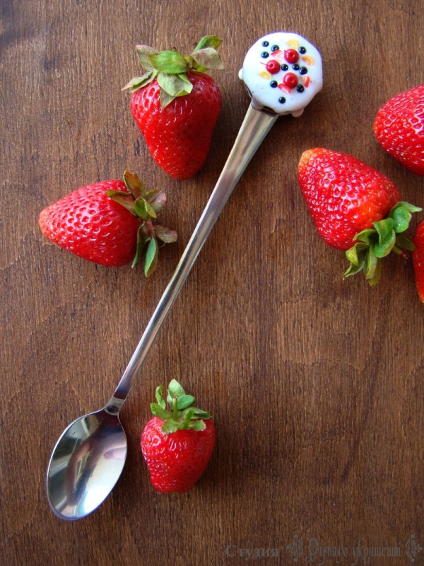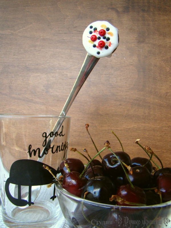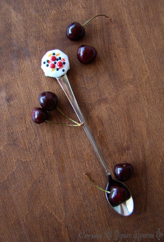 Ложечка - сувенир с декором в виде аппетитного тортика. Материалы: полимерная глина, гель, лак, коктейльная ложка из нержавеющей стали Диаметр торта 3 см, высота 1,5 см Длина ложки 21,5 см